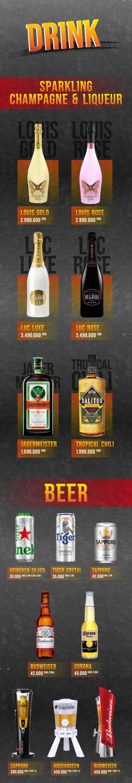 Đồ uống đa dạng, đặc biệt là bia