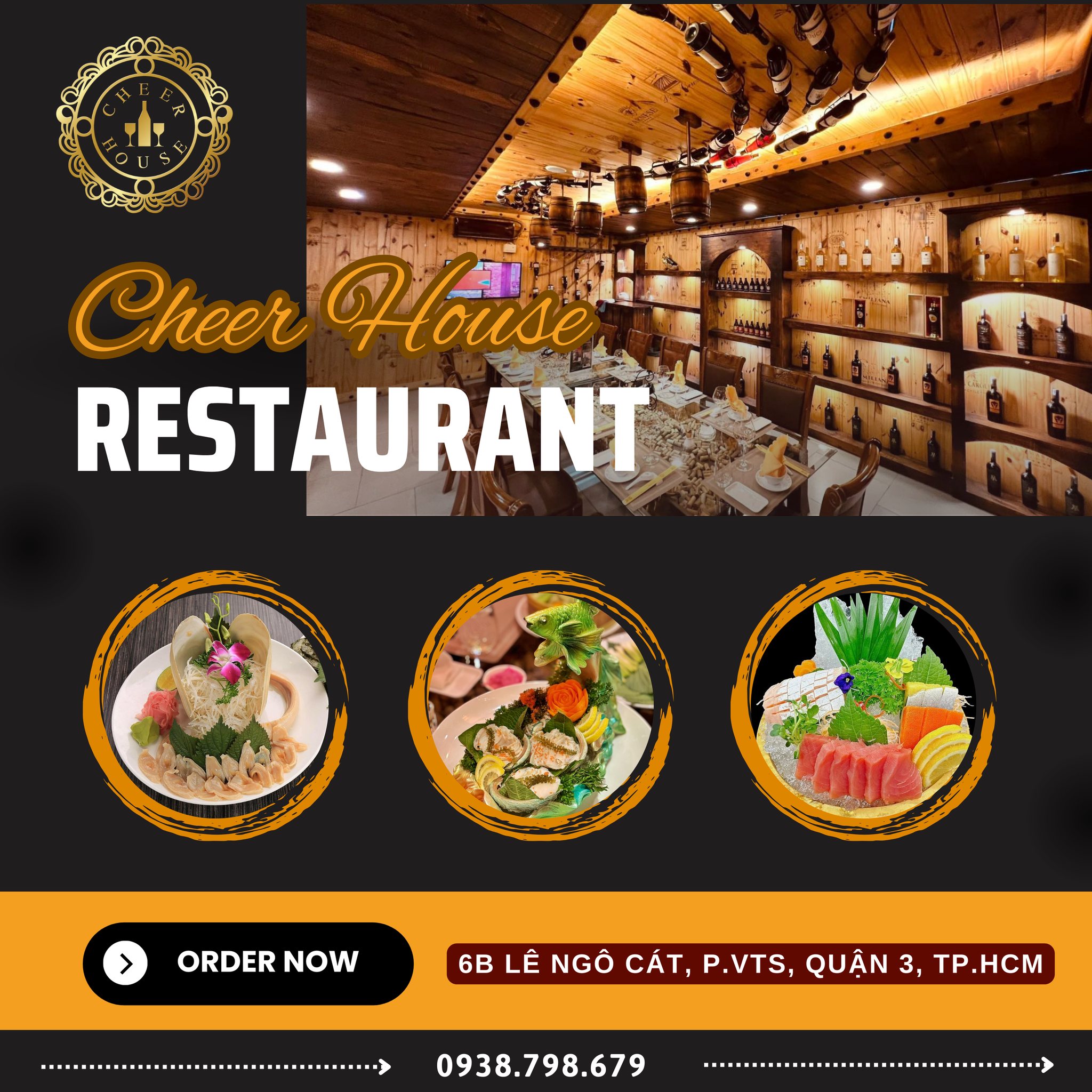 Nhà hàng hầm rượu Cheer House là lựa chọn lý tưởng cho những ai yêu thích rượu vang, ẩm thực chất lượng và không gian sang trọng. Với kiến trúc hầm rượu chuẩn Âu, thực đơn phong phú và dịch vụ chuyên nghiệp, Cheer House xứng đáng là điểm đến đẳng cấp tại trung tâm Quận 3.